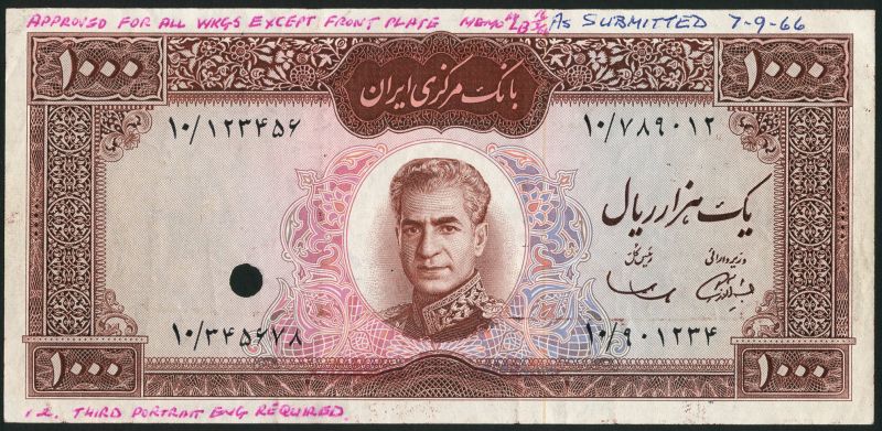 (†) Bank Markazi Iran, specimen for an unadopted 1000 rials, ND (1969), brown on red and blue underprint, Shah Pahlavi at centre, value at each corner, reverse Tomb of Hafez at Shiraz