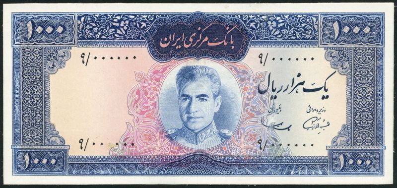 (†) Bank Markazi, an obverse and reverse composite essay on card for a 1000 Rials, ND (ca 1969), zero serial numbers, blue on pink and multicoloured underprint, portrait of Shah Pahlavi at centre, denomination in all four corners, reverse Tomb of Hafez at Shiraz