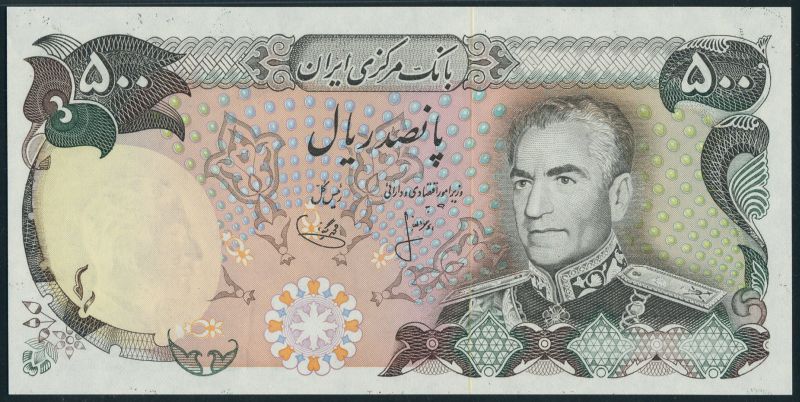 (x) Bank Markazi Iran, an error 500 rials, ND (1974-1979), no serial numbers, brown and multicoloured, Shah Pahlavi at right, signatures 15