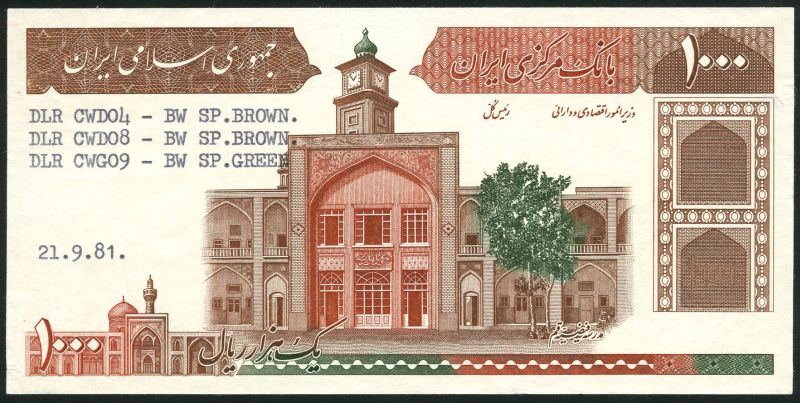 (†) Bank Markazi, obverse proof for 1000 Rials, 21 September 1981, green, red-brown and brown, Feyzieh Madrassa Seminary at centre, De La Rue codes for the three colours in black type at upper left, typed date at lower left,