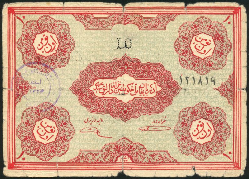 Iranian Azerbaijan, 1 toman, pale blue, 2 tomans, violet and white and a 10 tomans, red and pale green