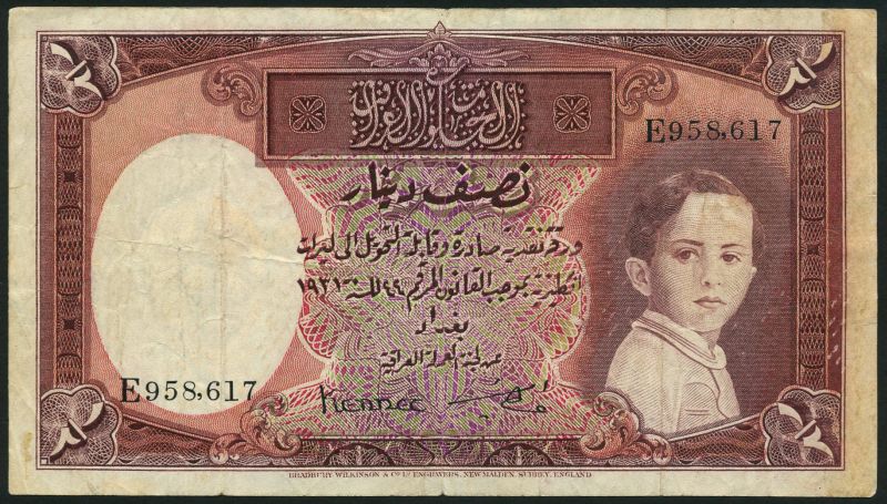(x) Government of Iraq, ½ Dinar, Law of 1931 (1942), brown on multicoloured underprint, King Faisal II as a child at right, reverse value at left; Central Bank of Iraq, 1 Dinar, Law of 1947 (1959), blue on multicoloured underprint, young King Faisal II at right, reverse equestrian statue of King Faisal I at centre