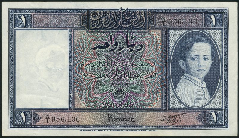 Government of Iraq, 1 dinar, law of 1931 (1942), serial number A/1 956136, blue and multicoloured, King Faisal II as a child at right, signature 9, Kennet and al Haidari, reverse blue