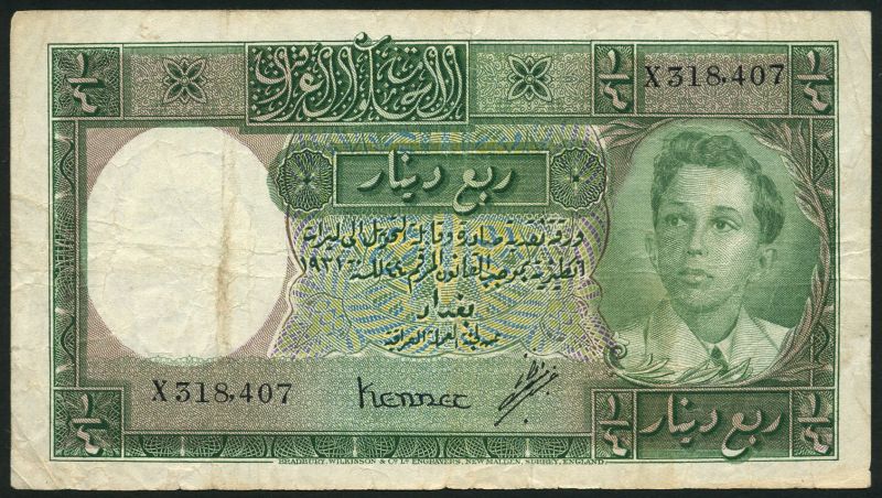 Government of Iraq, 1/4 dinar, 1931 (1948), serial number X 318407, green and multicoloured, King Faisal II as a youth at right, signed by Kennet and al-Khudairi, reverse green and white