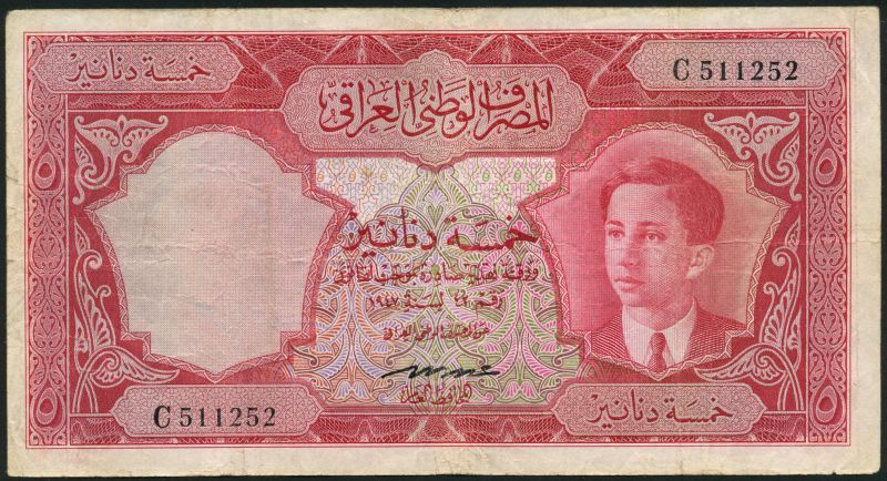 National Bank of Iraq, 1 dinar, pale blue and 5 dinars, red, all law of 1947, both King Faisal II as a youth at right, signature of Abdul Ilah Hafidh at low centre