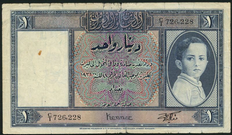 Government of Iraq/National Bank 1 Dinar, Law of 1931 (1942), serial number C/1 726228, signature Kennet and Ata Amin, blue on multicoloured underprint, portrait of King Faisal II as a child at right; ¼ Dinar, Law of 1931 (1945), serial number X664744, green and multicoloured underprint, portrait of young King Faisal II at right; ¼ Dinar, Law of 1947 (1955), serial number F/1 962355, green on multicoloured underprint, portrait of King Faisal II as an adolescent at right