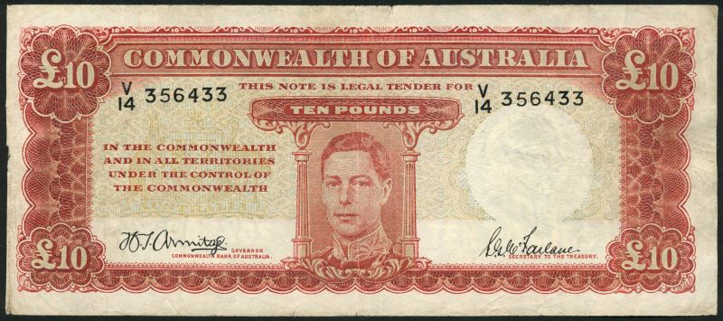 Commonwealth of Australia, £1, green, £5, blue and £10, red and green, all ND (1942/1952), all George VI in field, Armitage and Macfarlane signatures, the £5 Coombs Wilson signatures
