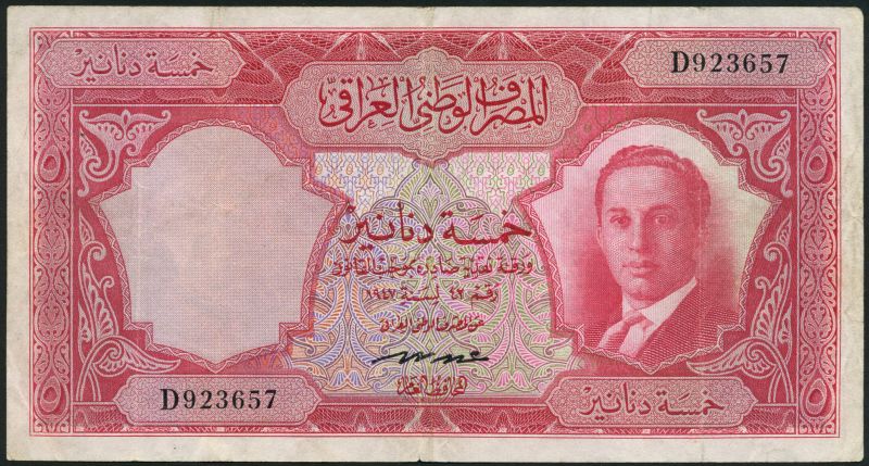 National Bank of Iraq, 1 dinar, 1947 (1955), serial number X/1 407596, pale blue and multicoloured, King Faisal II at right as a young man, also 5 dinars, 1947 (1955), serial number D 923657, red, King Faisal II as a young man at right, both signature of Abdul Ilah Hafidh at low centre