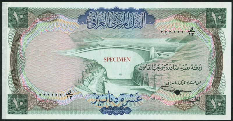 (†) Central Bank of Iraq, a group of specimen colour trials of the 1971, ND, Issue comprising 1 Dinar, purple and green, oil refinery; 5 Dinars, blue and brown, parliament building; 10 Dinars, green and brown, Dockdan dam, all overprinted SPECIMEN in red on obverse, one punch hole