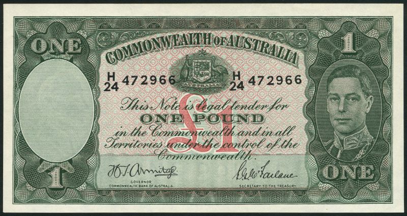 (x) Commonwealth of Australia, £1, ND (1942), prefix H/42, green and multicoloured, George VI at right, arms top centre,, Armitage-McFarlane signatures