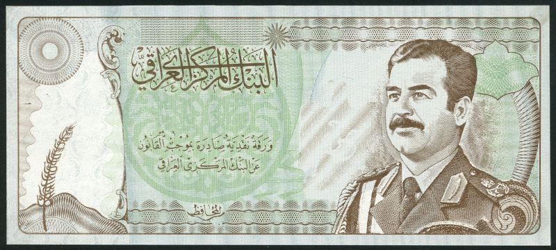 (x) Central Bank of Iraq, an unadopted essay for a 200 dinars, green and brown, Saddam Hussein at right