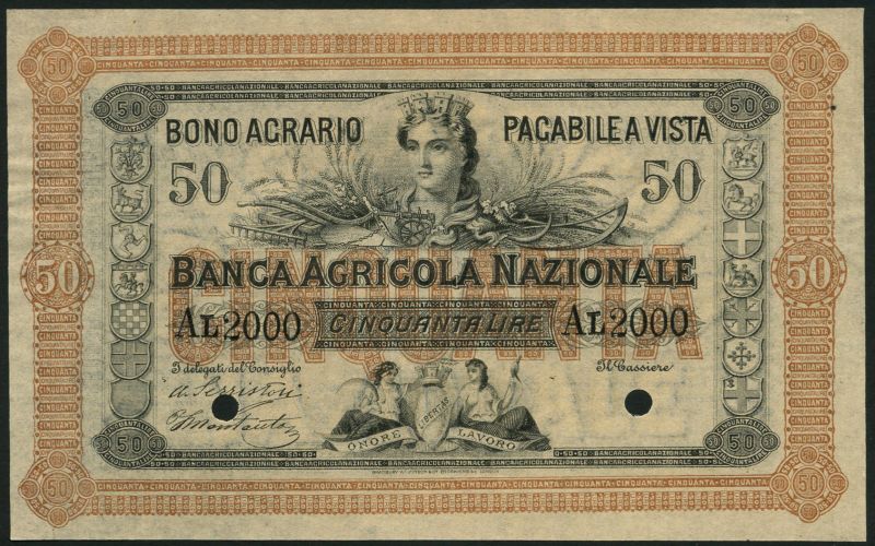 (†) Banco Agricola Nazionale, specimen 30 lire, Firenze, 1 June 1870, black and pink, bust of Italia top centre, maidens and amphora low centre, specimen 40 lire, green and specimen 50 lire, brown, same design as 30 lire reverse text