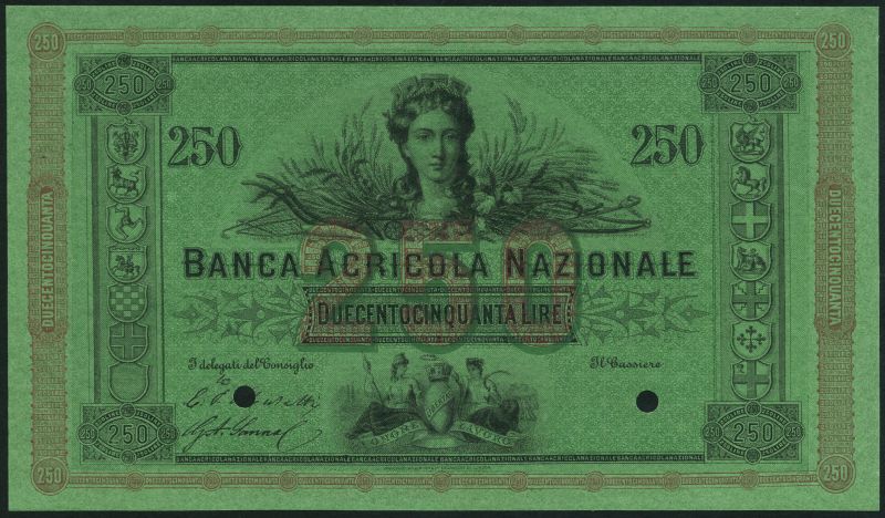 (†) Banco Agricola Nazionale, specimen 250 lire, Firenze, 1 June 1870, green and black, value in brown at centre, bust of Italia top centre, maidens and amphora low centre, reverse green and brown, text
