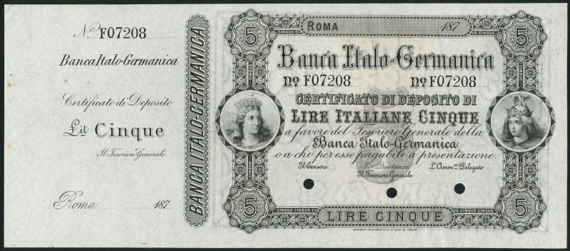 (†) Banca Italo-Germanica, Italy, specimen 5 lire, Roma, 187-, serial number F 07208, black and white, turreted female head at left, helmeted female head at right, Italia and Germania, counterfoil at left, reverse blue and orange, medallic female head at left and right