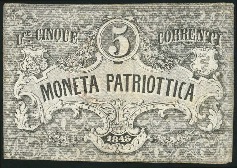 Moneta Patriotica, Venetian Republic, 3 and 5 lire, 1848, grey with circular seal of Venice handstamp