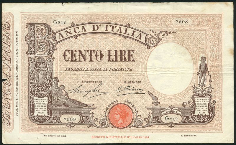 Banca d'Italia, 50 lire, 2 March 1931, serial number M 1234-0489, pale blue, Azzolini and Cima signatures, also 100 lire, 17 November 1930, pink-brown, Stringher and Cima signatures