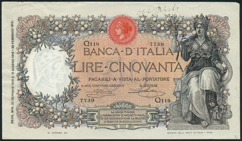 (x) Banca d'Italia, 50 lire, 1919, serial number Q119-7739, blue-grey and pale pink-orange, Italia at right, red Italia seal top centre, Canovai and Sacchi signatures, reverse farmer and plough team