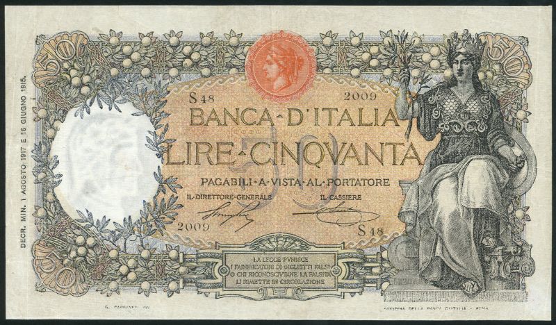 (x) Banca D'Italia, 50 lire, 1917, serial number S48-2009, orange-brown and muticoloured, Italia at right, Stringher and Sacchi signatures, red Arethusa seal top centre