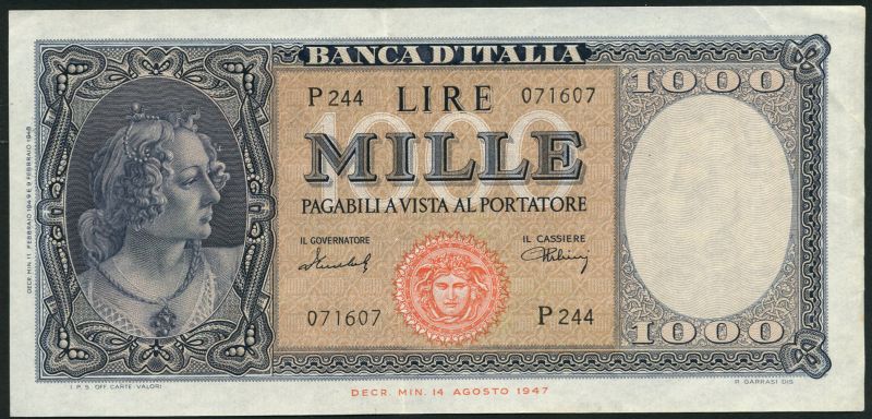 Banca D'Italia, 1000 lire (3), February 1948, serial numbers 071607/608/609, violet and pale brown, Italia at left, Einaudi and Urbini signatures, reverse blue-grey, bank title, monogram and value