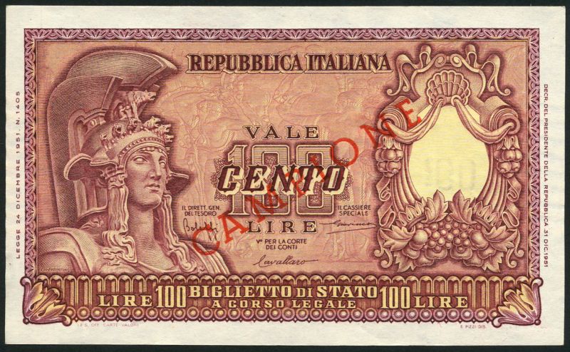 (x) Republica Italiana, specimen 50 lira, 1951, green, also specimen 100 lire, 1951, red-brown, both helmeted female head (Italia) at left, Cavallaro, Bolaffi and Giovinco signatures