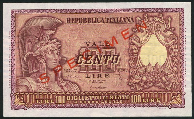 (x) Republica Italiana, specimen 50 lira, 1951, green, also specimen 100 lire, 1951, red-brown, both helmeted female head (Italia) at left, DiCristina,Cavallaro and Parisi signatures