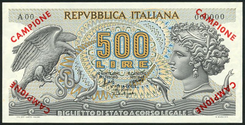 (x) Republica Italiana, specimen 500 lira (2), 1966, grey and multicoloured, Arethusa at right, eagle at serpent at left, also specimen 500 lire, 1974, pale blue and multicoloured, Mercury at right