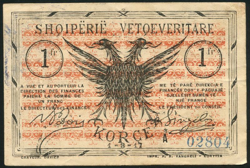 Albanian Regional issues, Korce, 1 franc (2), 1 March 1917, blue A02804, and 10 October 1917, violet C 01617, black on red-brown underprint, double headed eagle at centre, also territory of Koritza, 50 centimes, brown card, 1 franc, pink-red card, also Shkoder 10 and 20 qindar, 1920