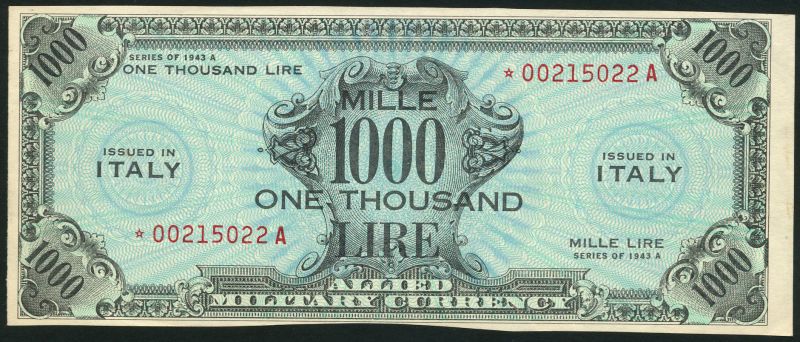 Allied Military Currency, Italian issue, 1000 lira, series 1943A, replacement serial number *00215022A, black on turquoise underprint, value at centre and each corner, reverse tan