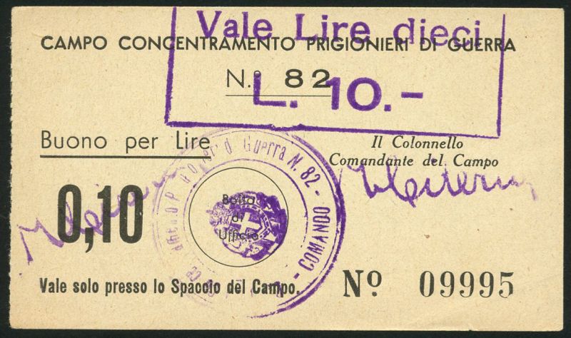 Campo Concentramento, No. 82, 0.10 lire, ND 91939-1945), serial number 09995, black text on pale tan paper with circular purple handstamp and revaluation handstamp 'Vale Lire dieci L.10'