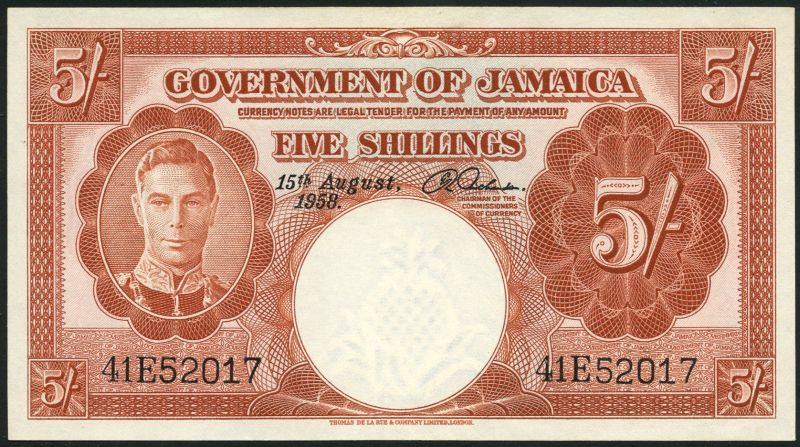 (x) Government of Jamaica, 5/-, 15 August 1958, orange, George VI at left, value at right and a Bahamas 4/-, green, George VI at right