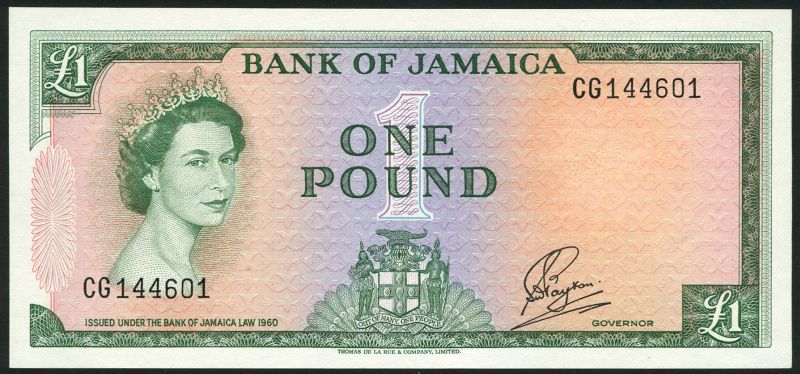 (x) Bank of Jamaica, £1 (2), Law of 1960 (1964), Gothic serial number AS 278281 and Roman serial number CG 144601, both Payton signature, green on multicoloured underprint, Queen Elizabeth II at left, arms at lower centre, reverse tractor harvesting