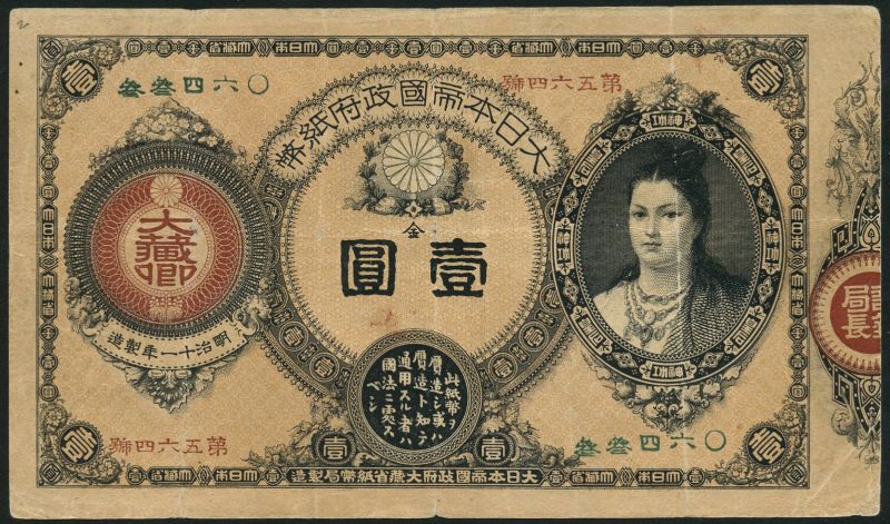 (x) Great Imperial Japanese Government note, 1 yen, 1878 (1881), black and pale brown, Empress Jingu at right, reverse pale blue central guilloche