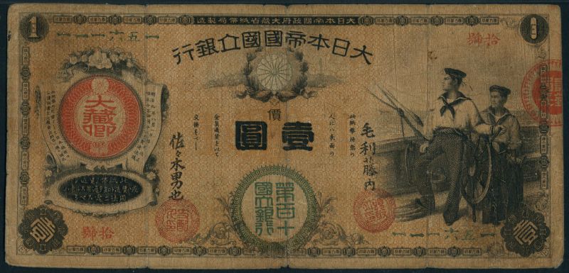 (x) Great Imperial Japanese National Bank, specimen 1 yen, ND (1877), serial number 111651, block 10, black and orange-brown, two sailors at right, reverse dark green and white, Ebisu at centre