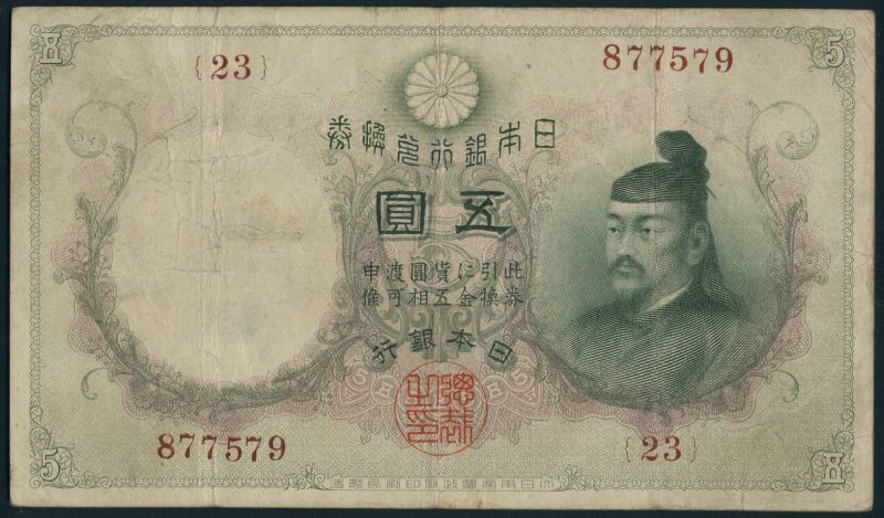 (x) Bank of Japan, Convertible Gold Note issue, 10 yen, 1910, maroon serial number 877579, block 23, green and lilac, Sugawara Michizane at right, reverse violet, value at centre, house at left