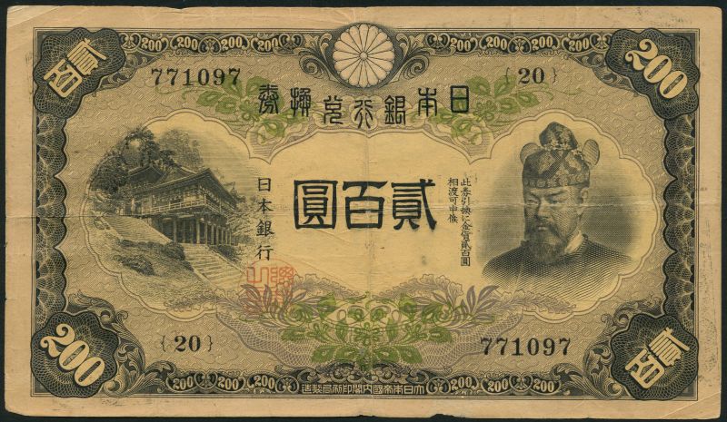 Bank of Japan, 5 yen, ND (1930), Michizane portrait, 20 yen, ND (1931), Kamatari at right, 200 yen, ND (1945), black and green, Kamatari at right