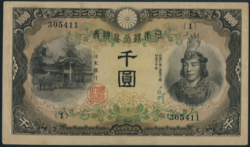 (x) Bank of Japan, 1000 yen, ND (1945), serial number 305441, block 1, black on brown and multicolour underprint, Yamato Takeru No Mikoto at right, Takebe Shrine at left, value at each corner