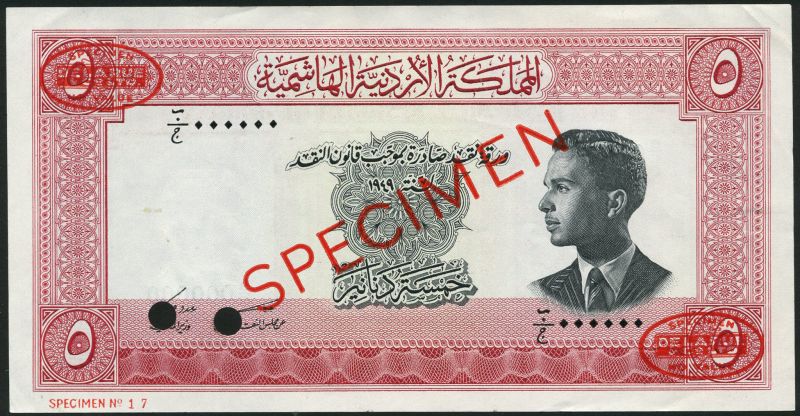 (†) The Hashemite Kingdom of Jordan, specimen 1 Dinar, Law of 1949 (1952), serial number B/G 000000, signature 6A, green and black, King Hussein at right, reverse ruins at Jerash; specimen 5 Dinars, Law of 1949 (1952), serial number B/C 000000, signature 9, King Hussein at right, reverse Treasury of Pharaoh at Petra, both overprinted SPECIMEN in red with two De La Rue Specimen ovals on obverse and reverse, two punch holes
