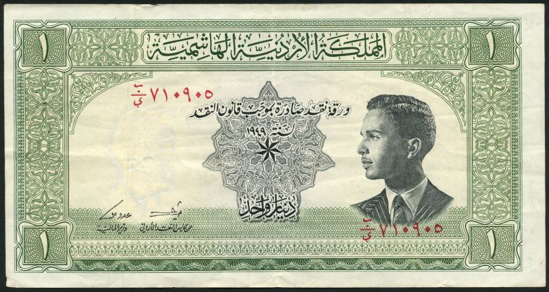 The Hashemite Kingdom of Jordan, 500 fils, law of 1949 (1952), red serial number B/D 114413, lilac and white, irrigation ditch at centre, signature 5, reverse lilac and white, cattle at centre, value at left and right, also a 1 dinar, law of 1949 (1952), red serial number B/J 710905, green and white, King Hussein at right, signature 6A