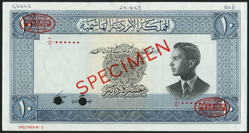(†) The Hashemite Kingdom of Jordan, specimen 10 Dinars, Law of 1959 (1965), serial number B/B 000000, signature 8, blue and black, King Hussein at right, reverse Treasury of Pharaoh at Petra, overprinted SPECIMEN in red with two De La Rue Specimen ovals on obverse and reverse, two punch holes