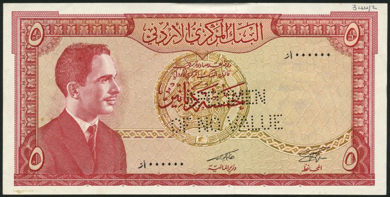 (†) Central Bank of Jordan, specimen 5 Dinars (2), ND, First Issue, both zero serial numbers, signature 12, the first overprinted SPECIMEN in black with two De la Rue Specimen ovals on obverse and reverse, one punch hole; the second perforated SPECIMEN OF NO VALUE, both red-brown on multicoloured underprint, King Hussein at left, reverse The Treasury at Petra