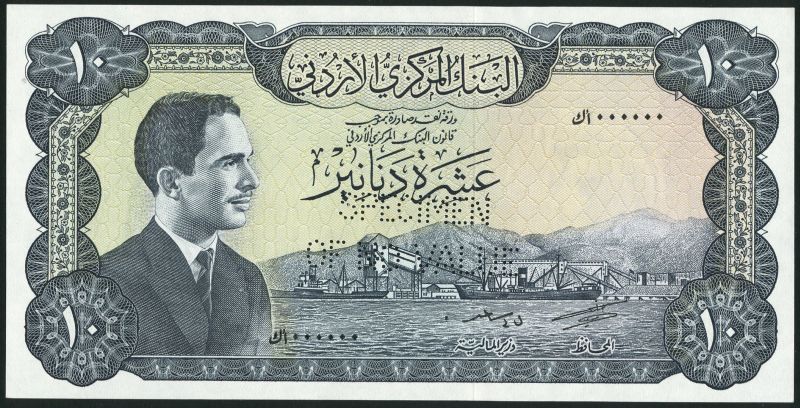 (†) Central Bank of Jordan, specimen 10 Dinars ND, Second Issue, zero serial numbers, signature 15, blue-grey on multicoloured underprint, King Hussein at left, ships and mountains at centre right, reverse Baptismal site, River Jordan, perforated SPECIMEN OF NO VALUE