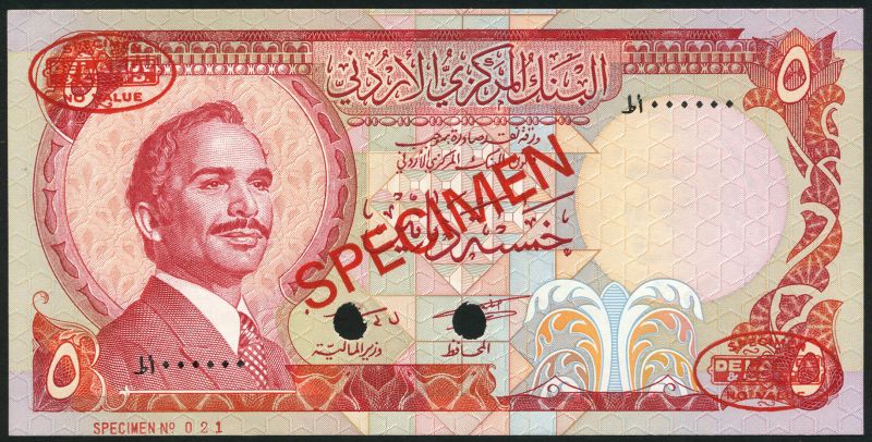(†) Central Bank of Jordan, specimen 5 Dinars (2), ND (1975-92), Third Issue, both zero serial numbers, different prefixes, both signature 15, overprinted SPECIMEN in red with two De La Rue Specimen ovals on obverse and reverse, two punch holes, King Hussein at left, reverse The Treasury at Petra