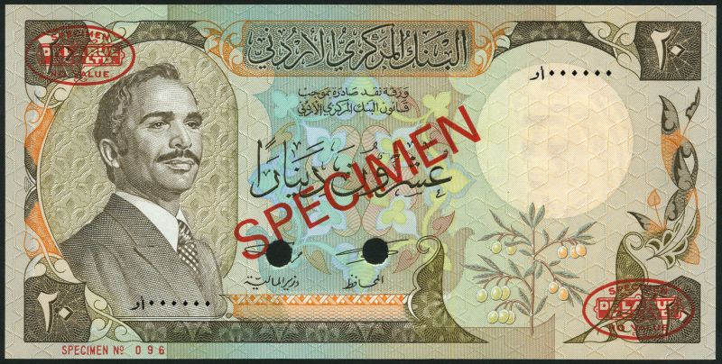 (†) Central Bank of Jordan, specimen 10 Dinars ND (1975-92), Third Issue, zero serial numbers, signature 15, blue-grey on multicoloured underprint, King Hussein at left, reverse Palace of Culture and Roman Amphitheatre, Amman; specimen 20 Dinars, 1977, signature 16, deep brown on multicoloured underprint, King Hussein at left, reverse thermal power station and agriculture, both overprinted SPECIMEN in red with two De la Rue Specimen ovals on obverse and reverse, two punch holes