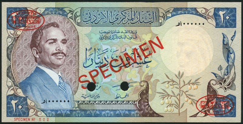 (†) Central Bank of Jordan, specimen 20 Dinars, 1977, signature 16, blue on multicoloured underprint, King Hussein at left, reverse thermal power station and agriculture, overprinted SPECIMEN in red with two De La Rue Specimen ovals on obverse and reverse, two punch holes