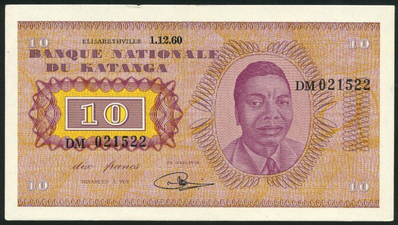 Banque Nationale du Katanga, 10 francs , 1 December 1960, serial number DM 021522, brown, violet and yellow, Moise Tshombe at right, value at left, reverse brown, violet and yellow, building at left, value at right