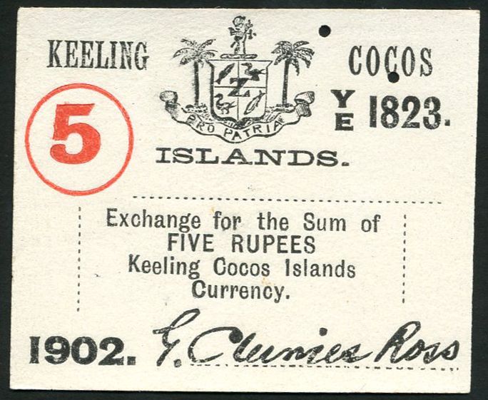 (x) Keeling-Cocos Islands, 5 rupees (6), 1902, black and white, arms top centre, value in red top left