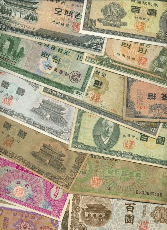 Bank of Chosen, Republic of Korea, a selection including 10 won, 1949 and 100 and 1000 won, 1950, a 1000 won of 1950, Rhee at left, 1000 won, 4285, Bank of Korea 1 and 100 won, 1953, 10 hwan, 1953 (2), 100 hwan,4288, 100 hwan, 4290, 1000 hwan, 4294, 100 hwan, 1962, 100 and 500 won, 1962, also various minor denomination and lesser issues (9)
