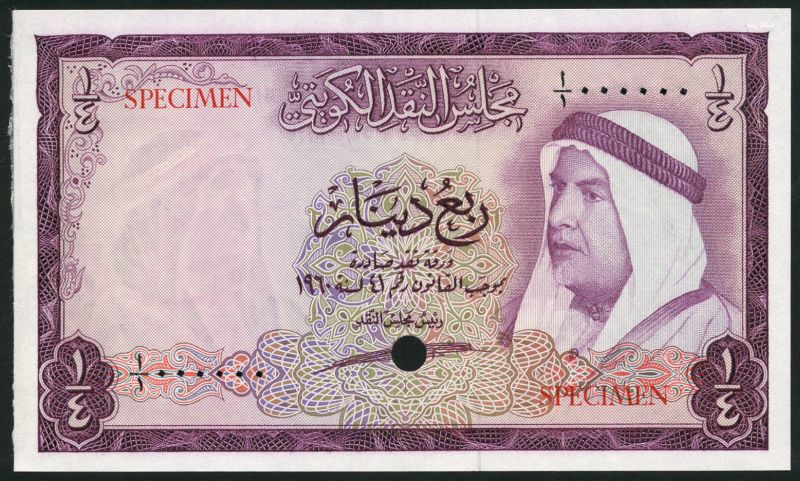 Kuwait Currency Board, colour trial 1/4 dinar, law of 1960 (1961), zero serial numbers, purple and multicoloured, Amir Shaikh Abdullah at right, value at each corner, reverse purple, the Port of Kuwait at left, value at each corner