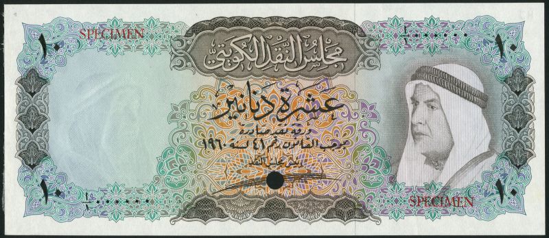 Kuwait Currency Board, colour trial 10 dinars, law of 1960 (1961), zero serial numbers, pale blue-green and multicoloured, Amir Shaikh Abdullah at right, value at each corner, reverse grey, dhow at centre