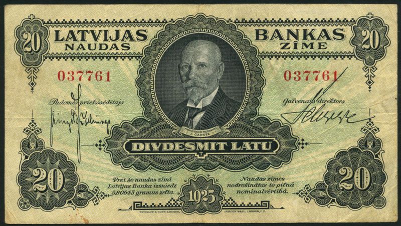 Government Currency note, Latvia, 20 latu, 1925, red serial number 037761, green and black, J. Cakste at centre, value at centre and at each corner, reverse green, arms at centre, value at left and right, also 25 latu, 1928, red serial number B350230, black and pale orange, Valdemars at centre, reverse blue, arms and value